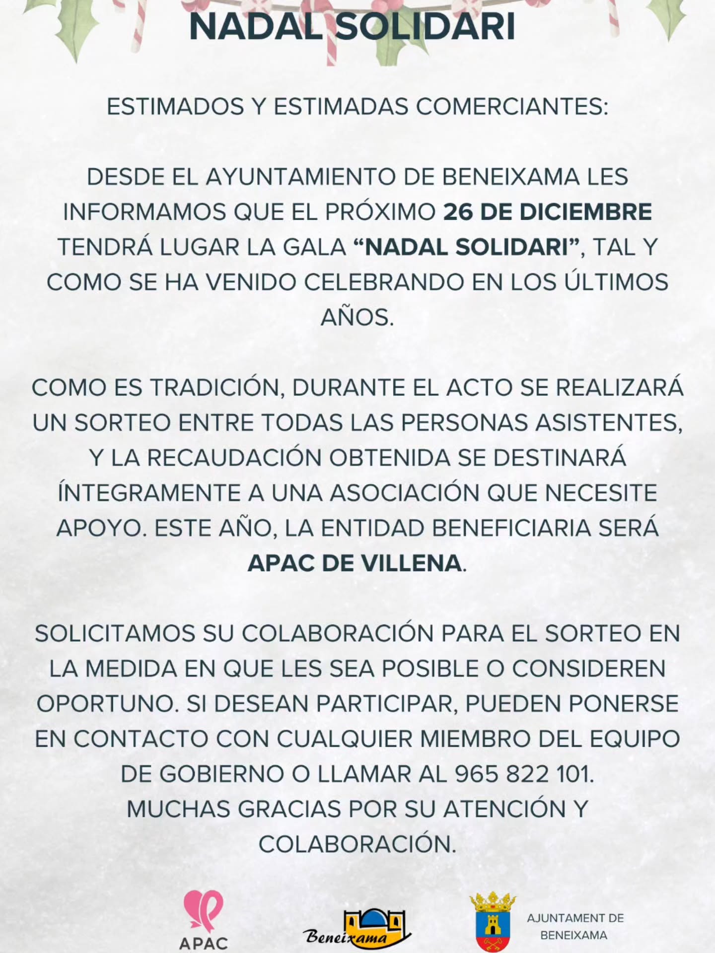 El 26 de diciembre vuelve una de las citas más especiales del año. Durante la gala se realizará un sorteo entre todas las personas asistentes, y todo lo recaudado irá destinado íntegramente a APAC Villena, que este año somos la entidad beneficiaria.