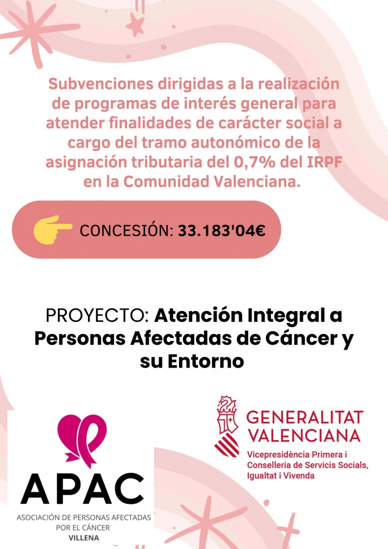 La Consellería de Igualdad y Políticas Inclusivas, en su convocatoria de Ayudas para promocionar el DESARROLLO DE PROGRAMAS DE LAS PERSONAS CON DIVERSIDAD FUNCIONAL Y PROBLEMAS DE SALUD MENTAL, ha realizado concesión directa este año por lo que a APAC le ha vuelto a conceder 27.000€ para que continúe un año más realizando su proyecto de "Atención y apoyo sociosanitario a las personas afectadas de cáncer y sus familias".